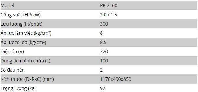 - Thông số kỹ thuật của máy nén khí piston Puma 2HP Đài Loan